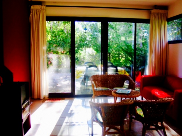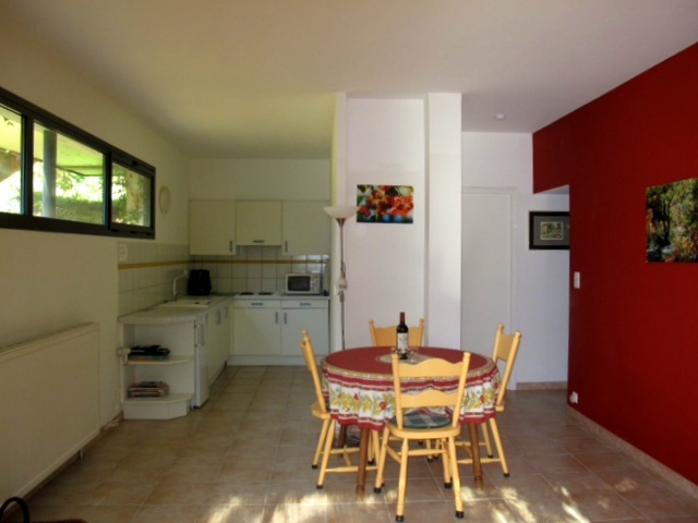 Er is een royale, sfeervolle woonkamer ( radio, cd speler en nu ook tv.). met eethoek en zitgedeelte. Een open keuken met veel kasten, koelkast, electrische kookplaten, magnetron, afzuigkap, serviesgoed, bestek en pannen. Een slaapkamer met tuindeuren naar het terras met een tweepersoonsbed en secretaire. Een tweede slaapkamer heeft twee een-persoonsbedden